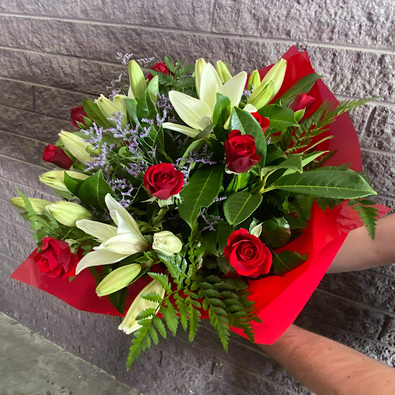 Rose & Lily Bouquet- A bouquet featuring 10 Stems of Red Roses mixed with White Lilies, Greenery & Misty Blue.